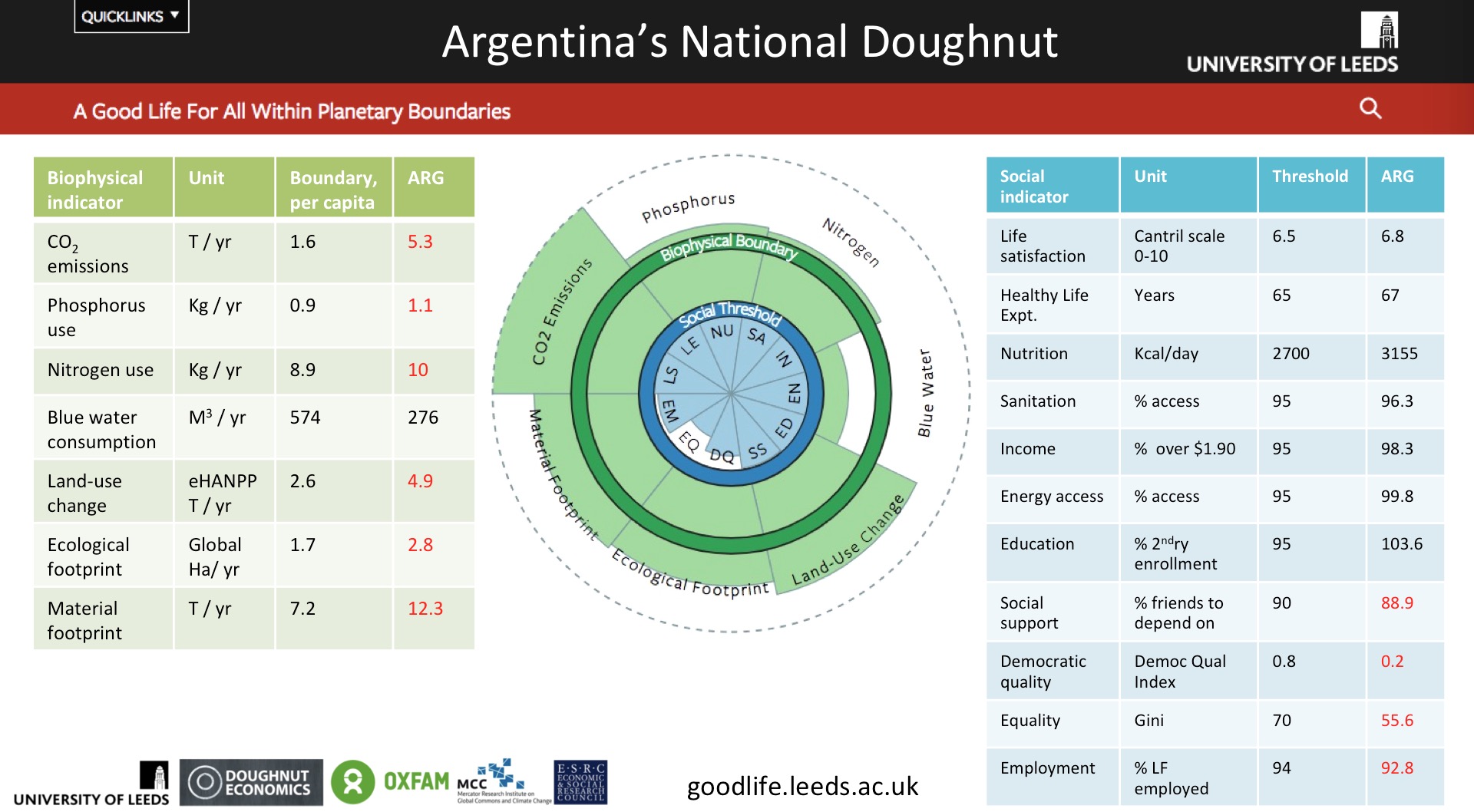 Hi Ian, these are all good points. As I see it, the team in Leeds were looking to create a set of internationally comparable doughnuts and hence were constrained by internationally relevant metrics and available data. So the result for any individual country is not going to feel as accurate and relevant as nationally-chosen metrics. Which means that there is a parallel project of creating nationally bespoke versions of the doughnut which use the most relevant and best available data for each nation. A team at Oxfam had a first go at doing this some years ago