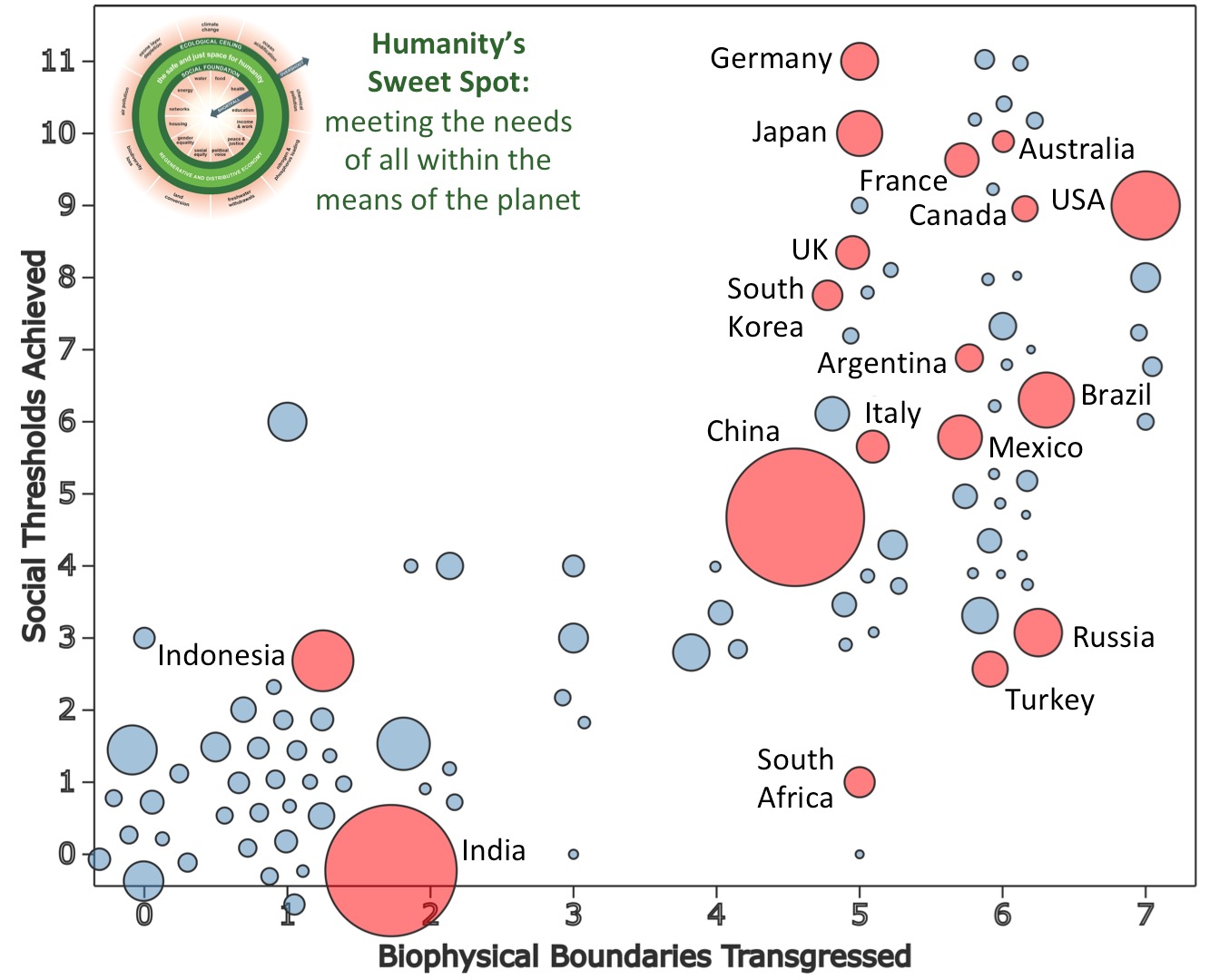 Hi-I have a comment about Canada’s position on the graph…living in Toronto, and seeing first hand how many folks are homeless, needing medical/psychological care(being homeless, go figure!)…and of course you see the economic inequality folks here are willing to tolerate…I just don’t see this as sustainable. We are inside the graph’s sweet spot socially but outside the biophysical boundary…the US too.