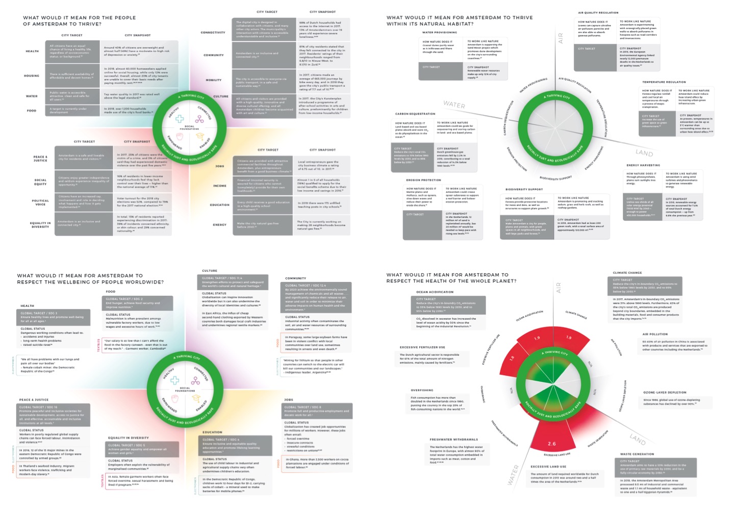 These questions turn into the four ‘lenses’ of the City Doughnut, producing a new ‘portrait’ of the city from four inter-connected perspectives. Drawing on the city’s current targets for the local lenses, as well as on the Sustainable Development Goals and the planetary boundaries for the global lenses, we compared desired outcomes for the city against statistical snapshots of its current performance (see the published tool for full details).